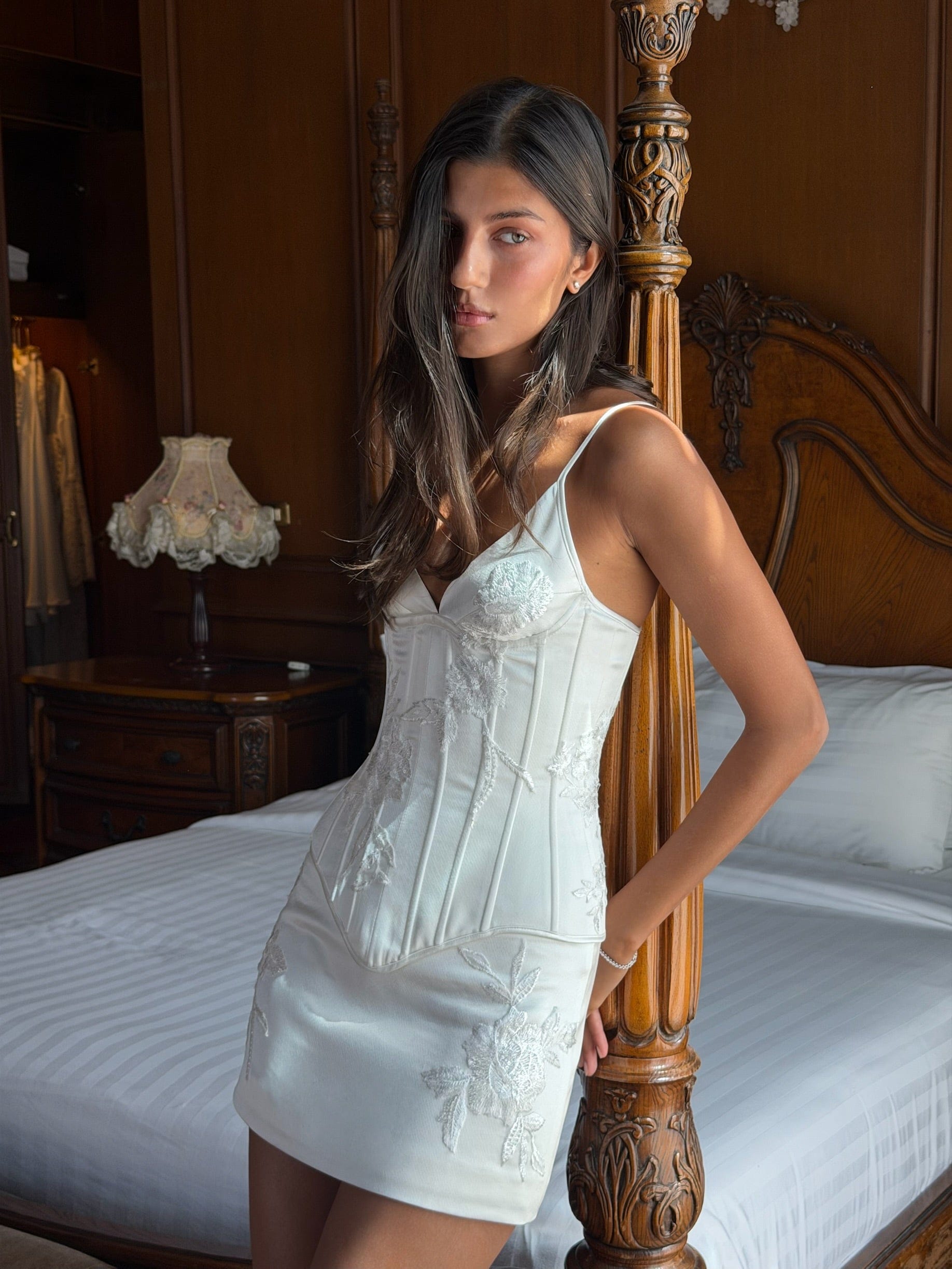 The Belle Mini Skirt is romance meets playfulness. Crafted from luxe Valentino japan satin with delicate sequin embellished detail. A fresh take on bridal dressing.