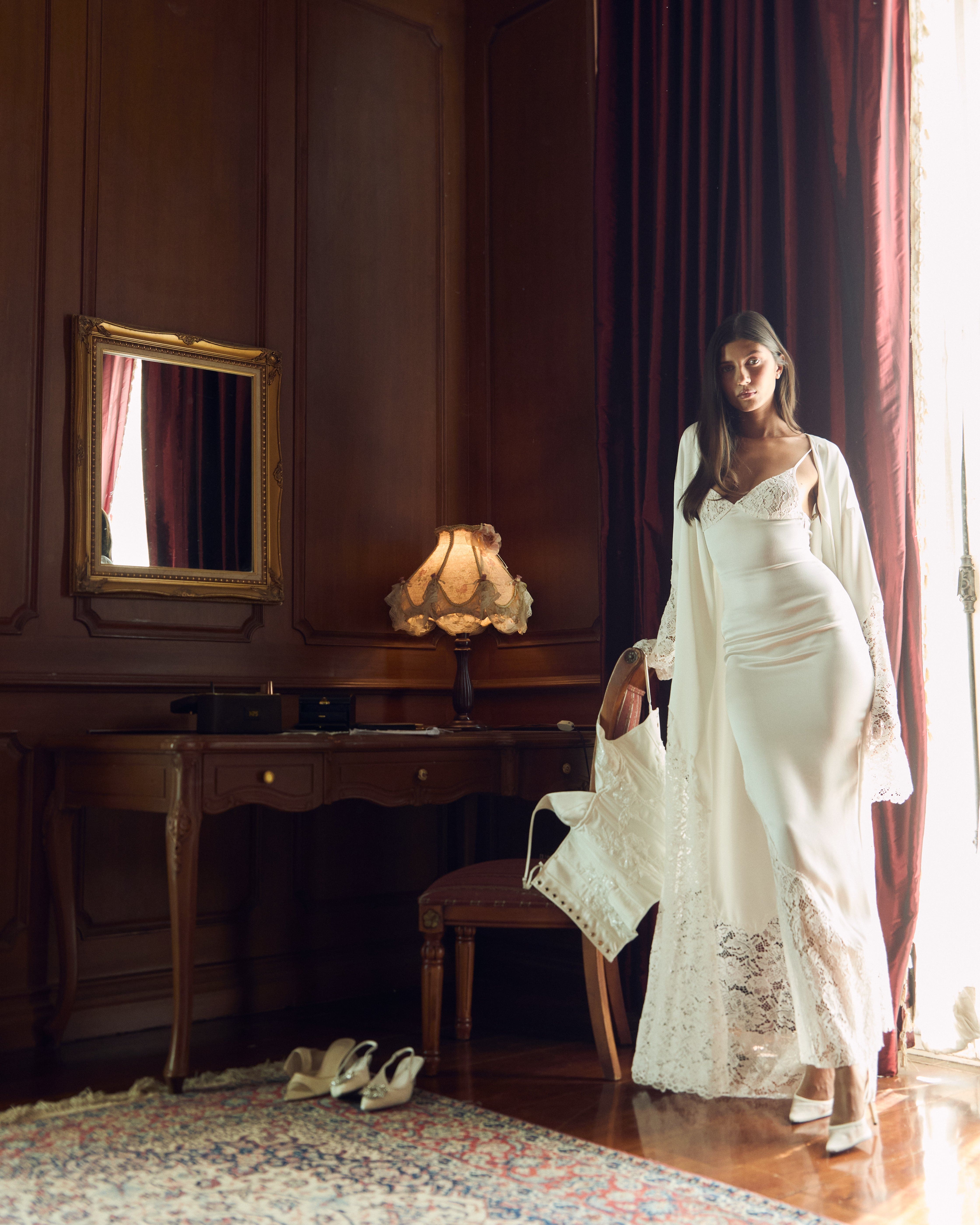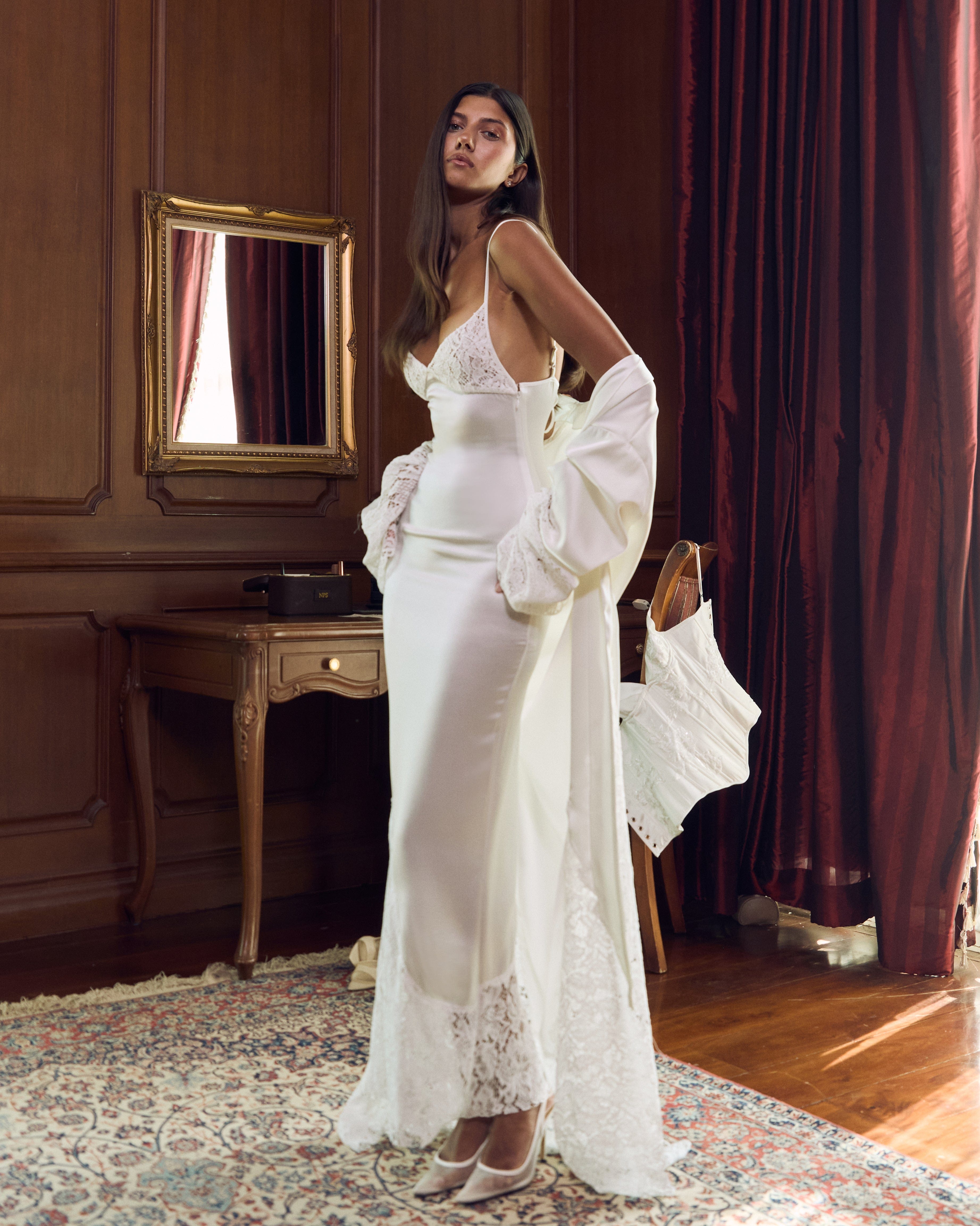 • Model is wearing the Elodie Bridal Robe in size XS. Her measurements are: height is 5'9", bust is 31½", waist is 22½"