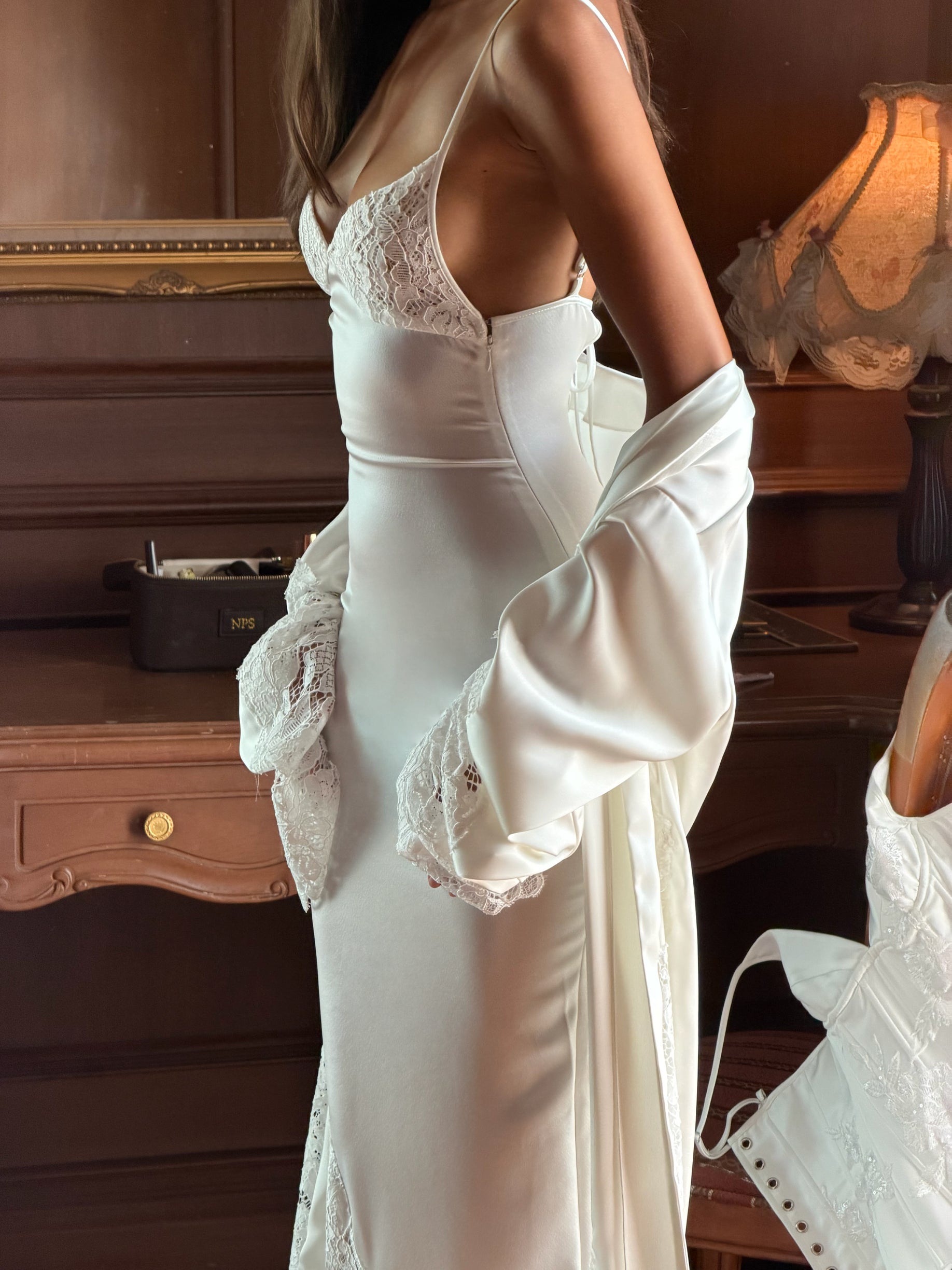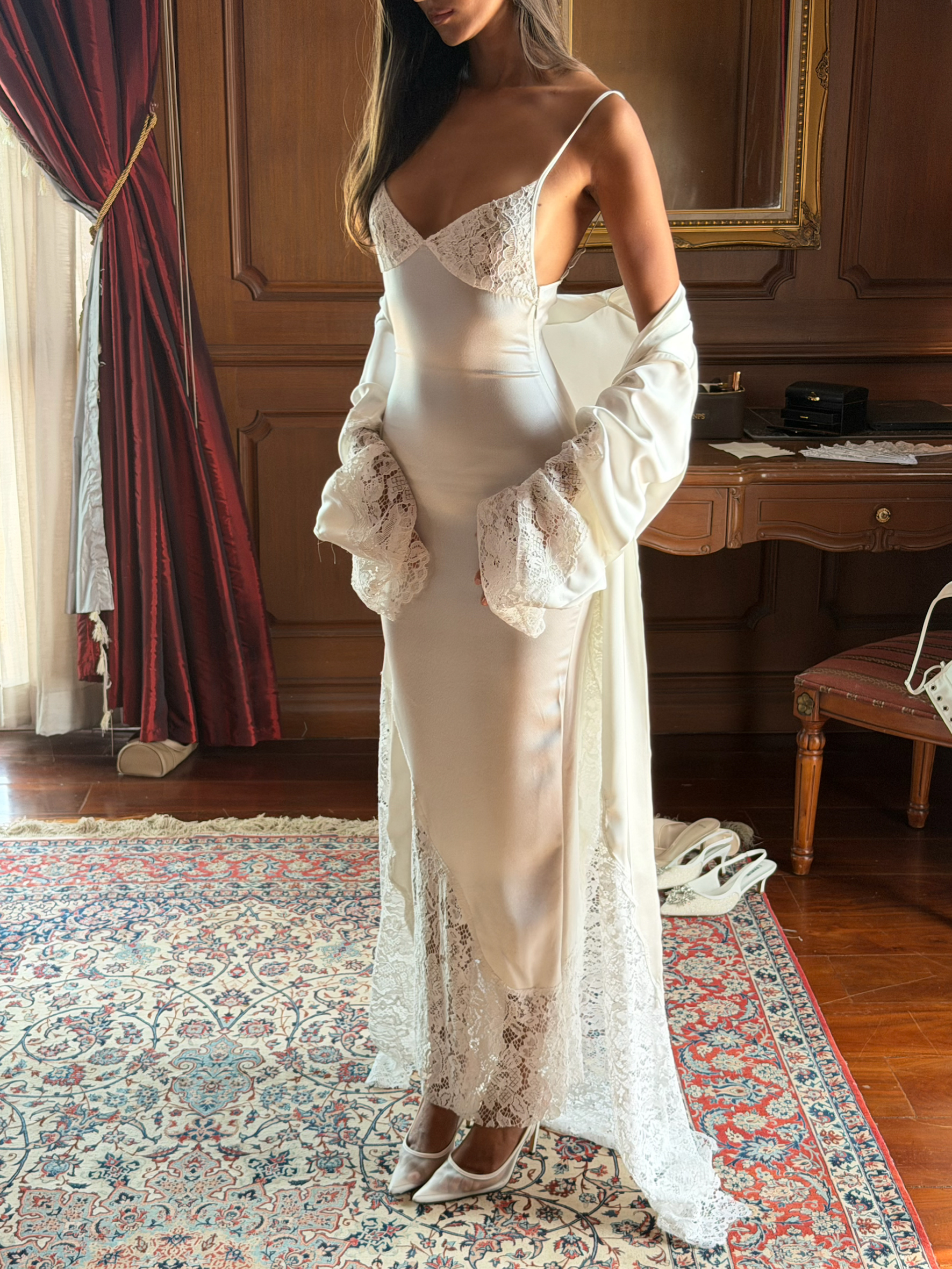 The Elodie Bridal Robe is pure romance. Crafted from premium satin with intricate lace detailing along the sleeves and hem, this floor-length robe drapes beautifully for an effortlessly elegant silhouette. Perfect for getting ready moments, bridal portraits, or lounging in timeless style.