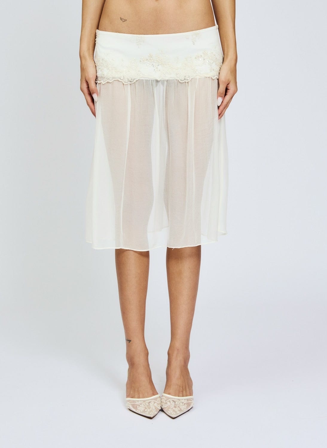 Romantic yet understated, this sheer ivory midi skirt drapes softly over the body. A low rise lace–embroidered waistband midi. Designed for endless styling possibilities — from romantic evenings to effortless daywear.