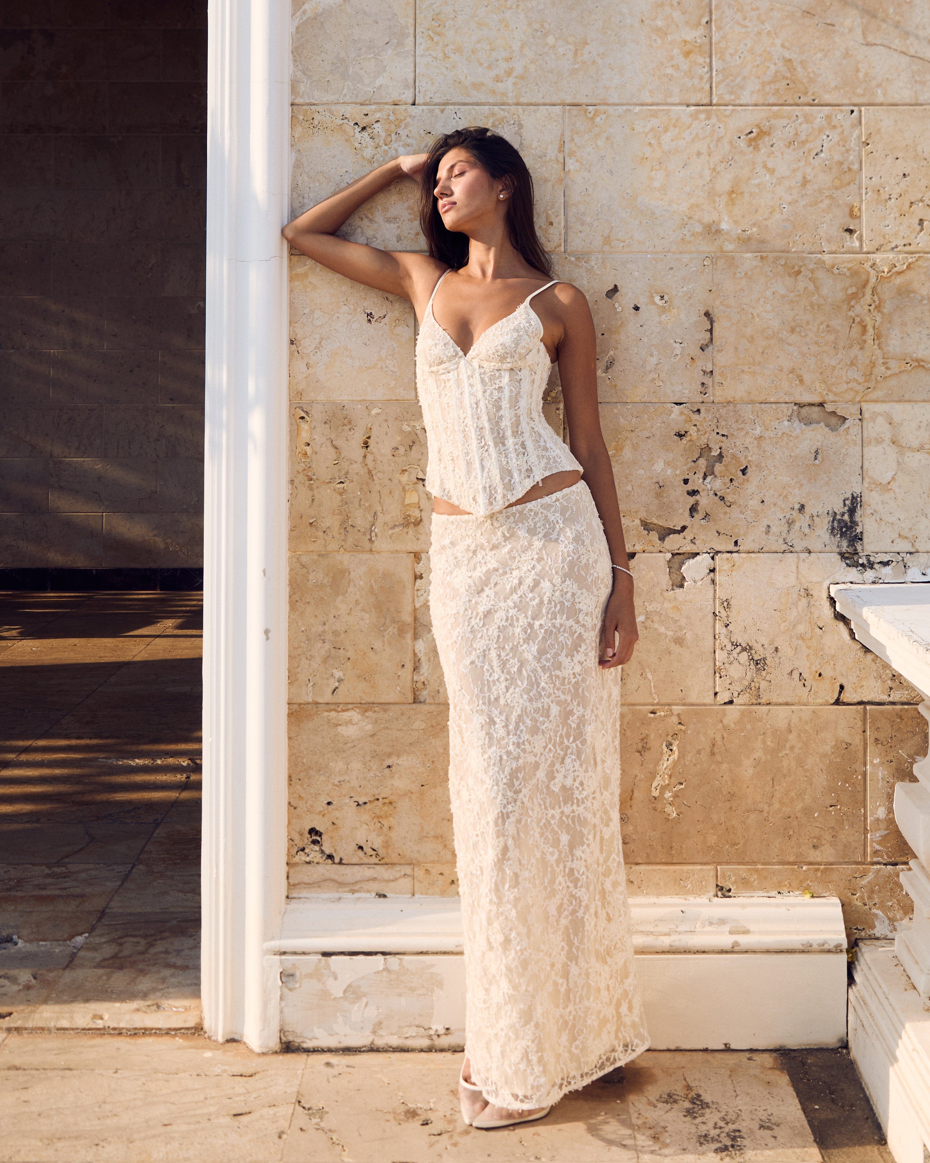 The Leona Maxi Skirt is effortless glamour. Crafted from sequined lace with a low waist and floor-length silhouette that moves beautifully. Pairs perfectly with the Carolyn Corset for a complete bridal look or worn with your favorite top for versatile styling.