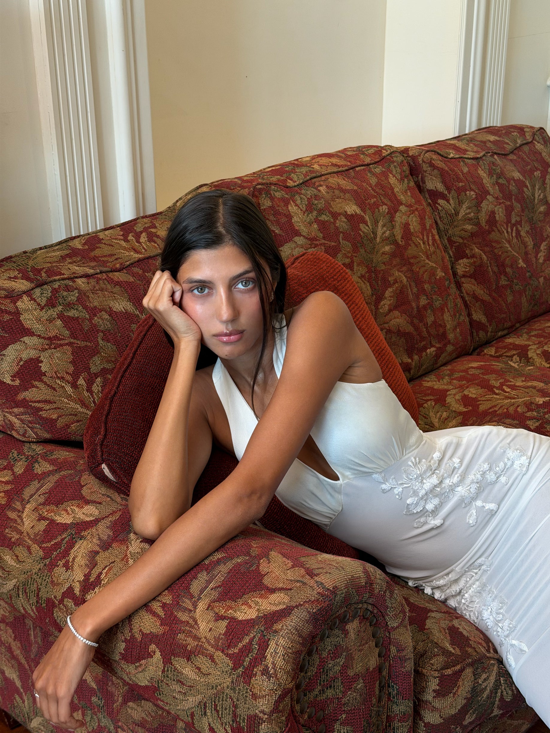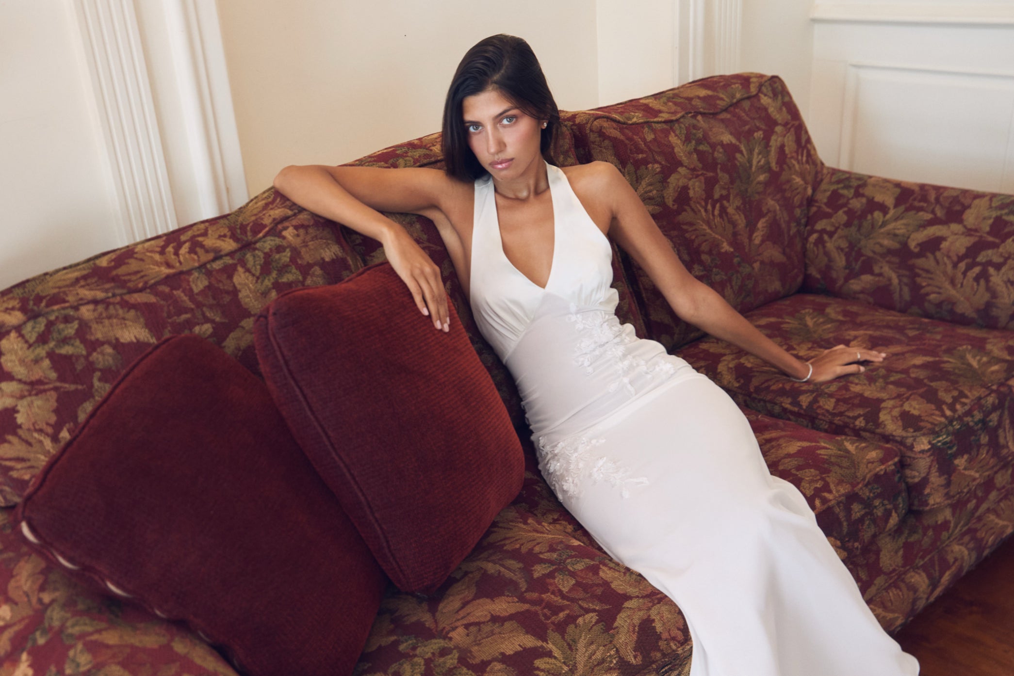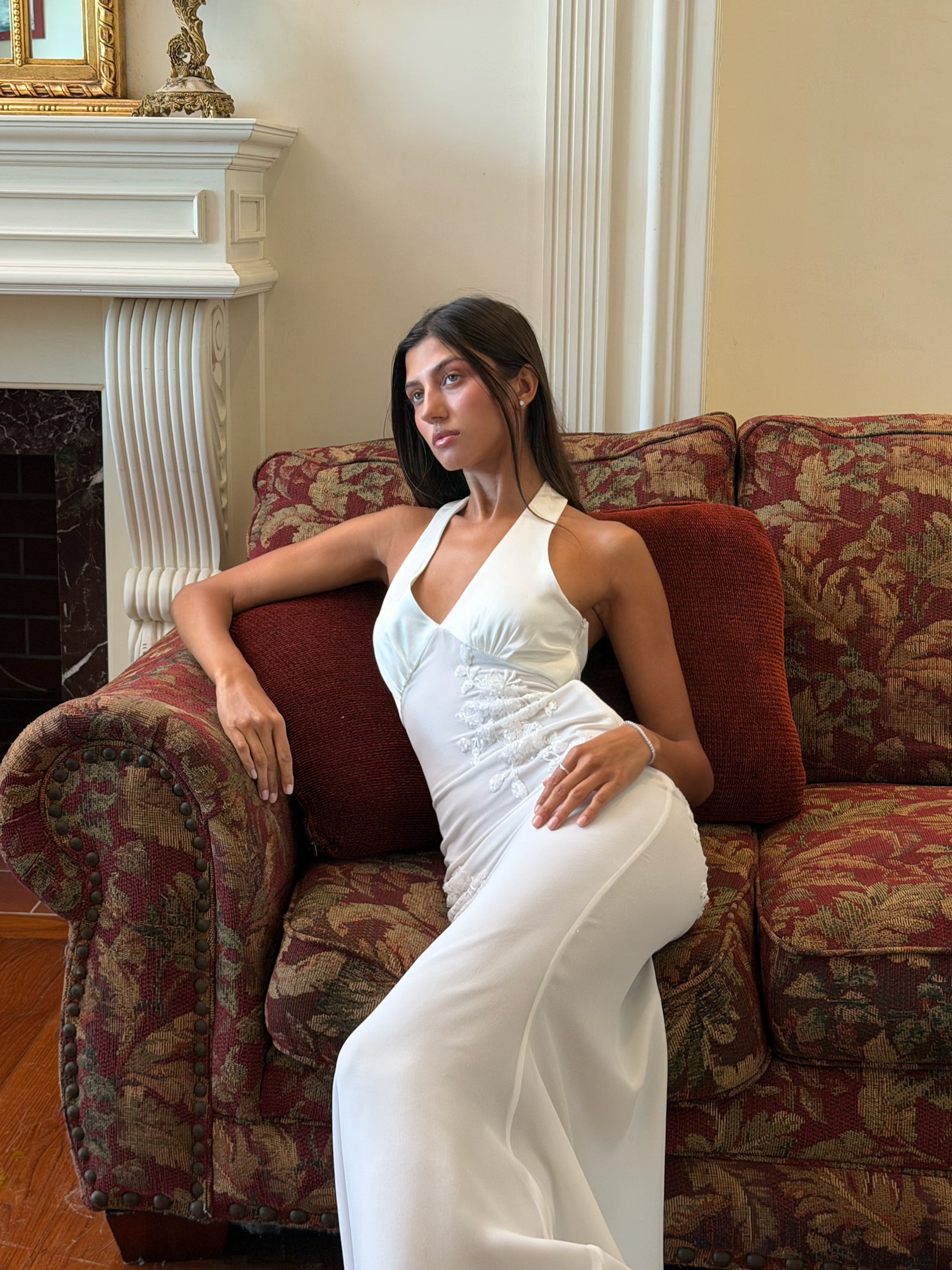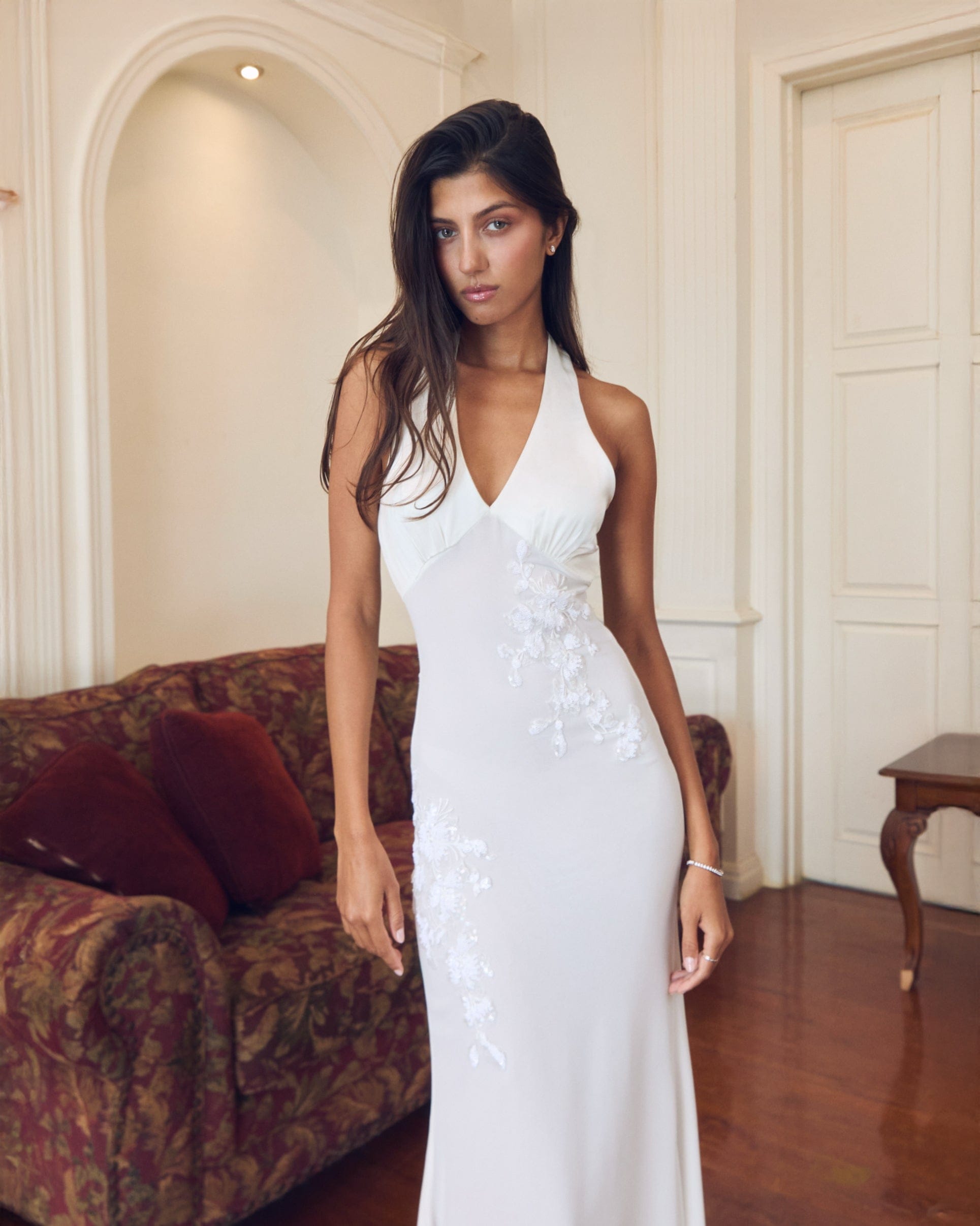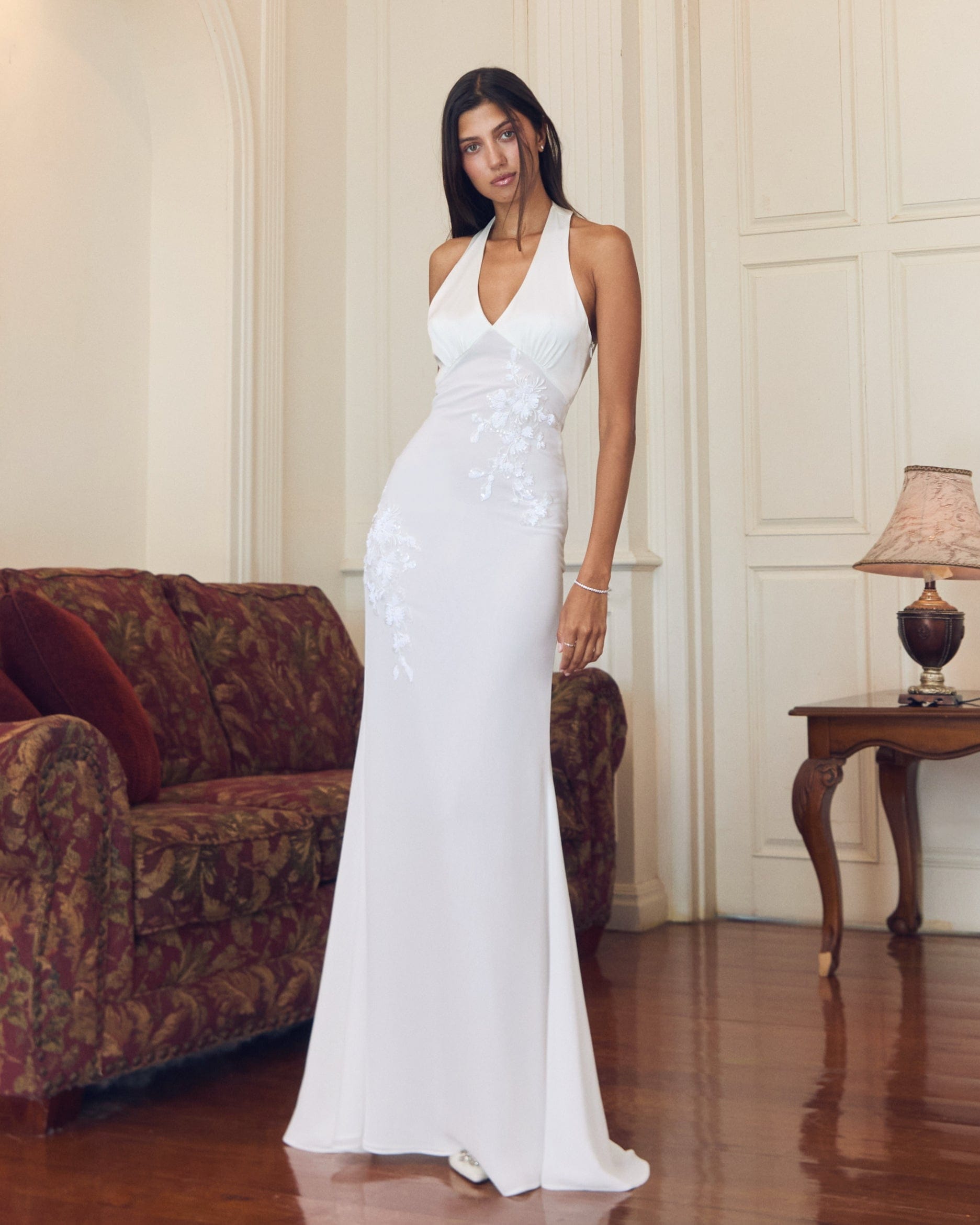 The Sophia Maxi Dress is crafter from luxe Valentino japan satin and silky chiffon with a plunging halter neckline and delicate floral appliqué detailing. The figure-hugging silhouette flows into a floor-length skirt for a timeless, sophisticated look.