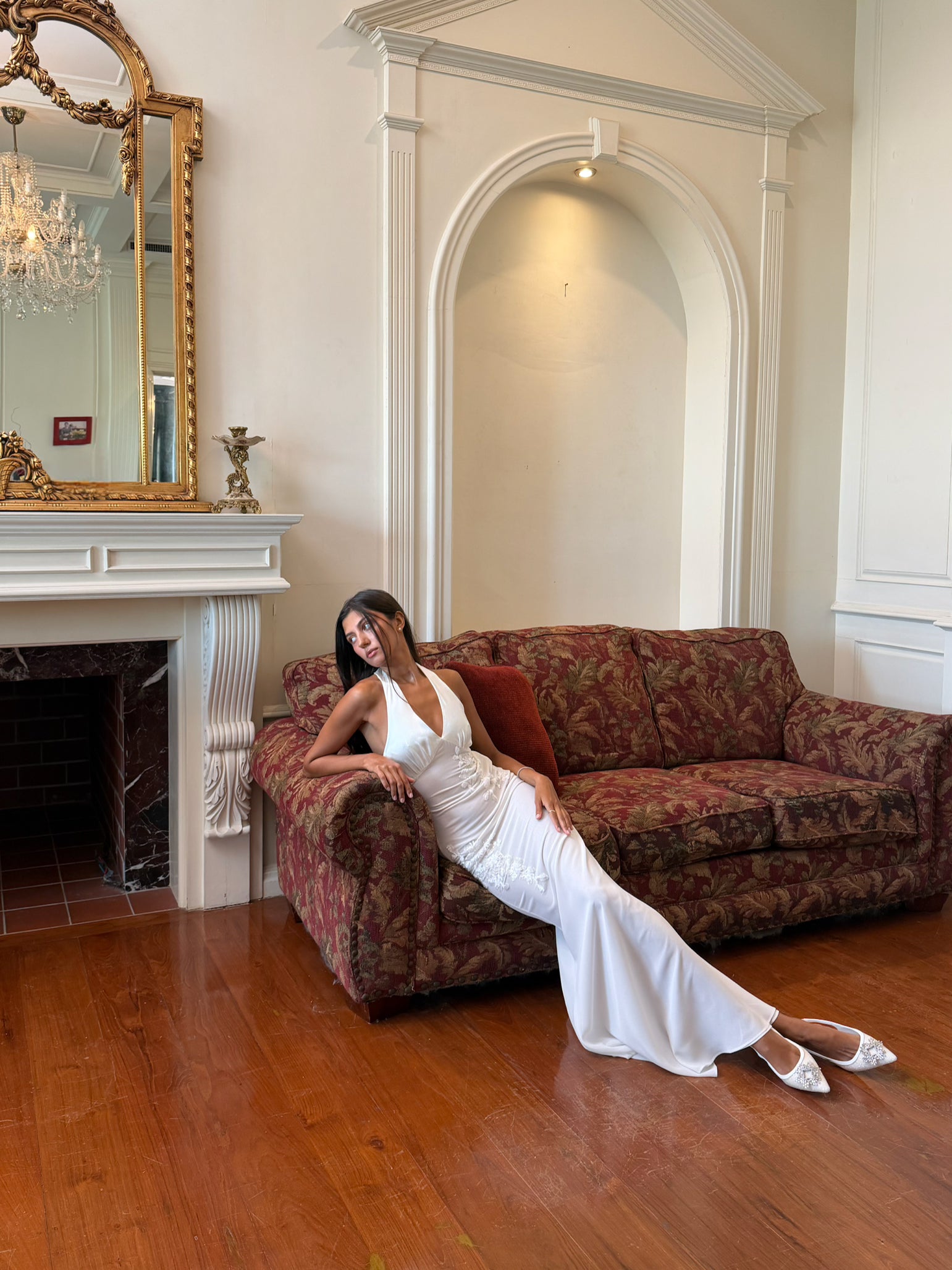 - Floor-length silhouette