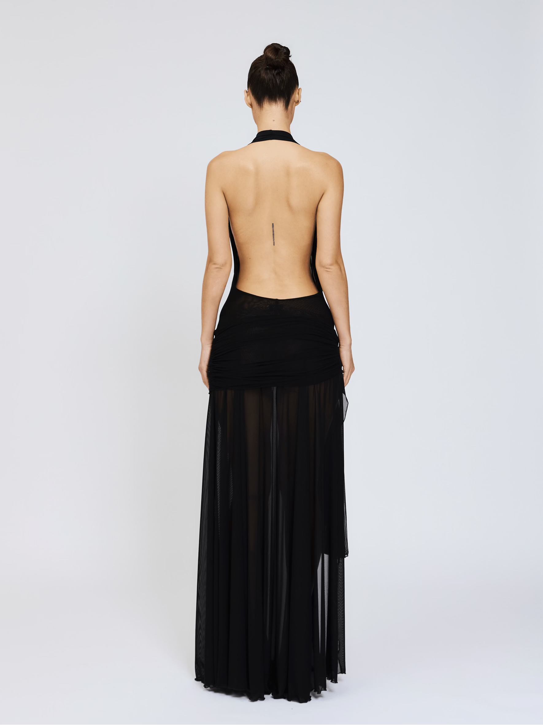 The Evelyn Maxi Dress in Black Mesh Maxi Dress that features a plunging draped halter neckline and softly ruched detailing around the hips, cascading into a floor-length hem.
