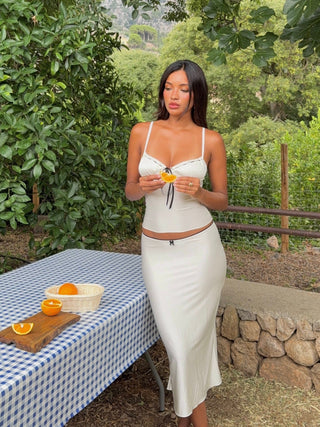 A dainty lace camisole top with white lace trim, delicate bow trailing down the décolletage. She is 90’s vintage inspired, playful, and has a feminine silhouette with a polka dot print. You can effortlessly pair this top with any item in your wardrobe, including its matching skirt that accentuate your curves. Available in Solid White, Black and Polka Dot.