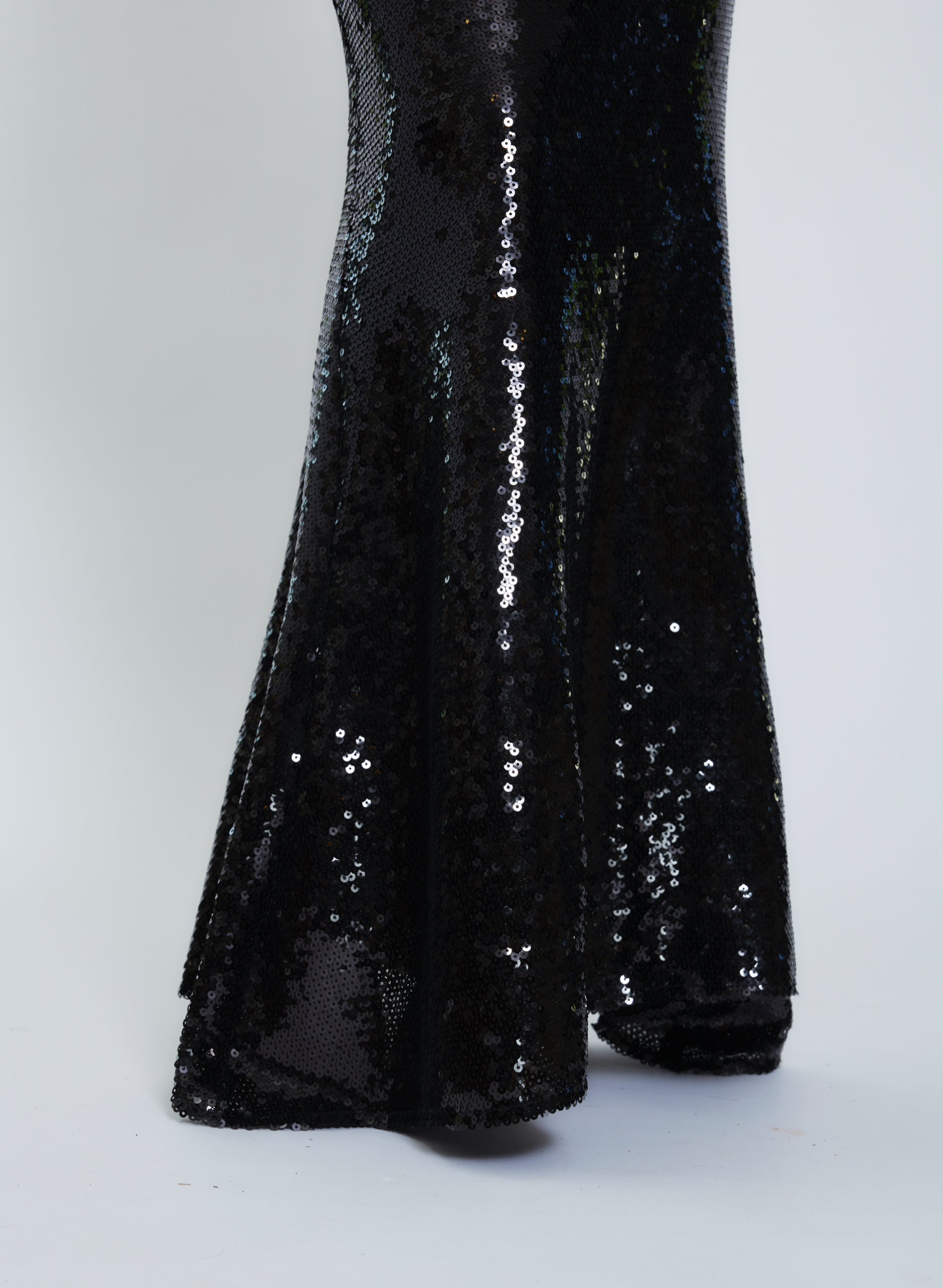 The Gloria Maxi Dress brings a touch of drama to the classic sequin gown. Designed in gleaming black sequins, this full-length silhouette features delicate spaghetti straps, a corset with adjustable details, and a smooth side zip. The draped maxi skirt is accented with hand-sewn rosettes, adding soft dimension and movement. Elegant, striking, and effortlessly refined — ideal for formal evenings and special celebrations.